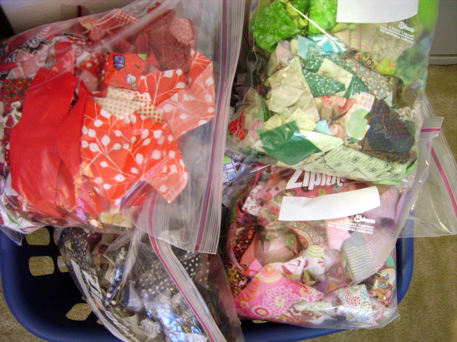 My bags of scraps were raring and ready to play. I can't tell you how many times I've wanted to dump them all together again, but dang it took a long time to color coordinate them. Plus, it would make me sneeze and I'm already sneezing plenty during this lovely allergy season. Some dumping did occur. It was messy. It was fun.